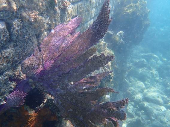 Views of the fort foundation and coral, plants and urchins growing around it