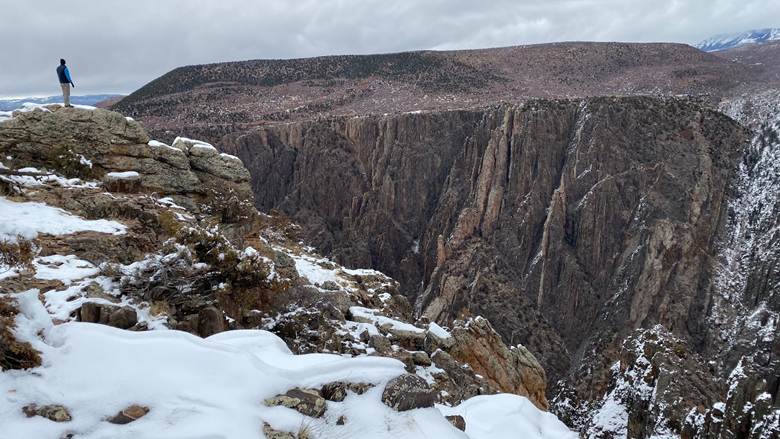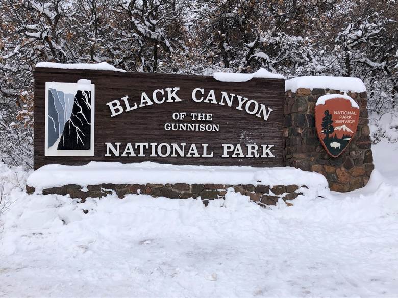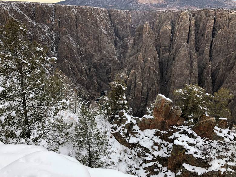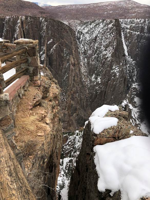 We arrived at Black Canyon from Great Sand Dunes to a nearly deserted Visitor Center and Park – There are no roads to the bottom of the canyon and the trails are quite steep and not really doable (or perhaps open) without ice climbing gear in the winter. The South Rim Trail beyond the Visitors Center was closed as it usually is in the winter. The North Rim Visitors Center is closed in the winter time.